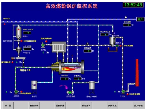 煤粉锅炉系统监测与控制设备,主要由工控机、变频器、控制仪表、压力和温度传感器、火焰探测器、含氧量分析仪、PLC、上位机监控软件以及其它低压保护和控制电器等元器件构成。采用先进的工业自动化、测控、变频和通讯网络技术,对系统进行全自动寻优控制。